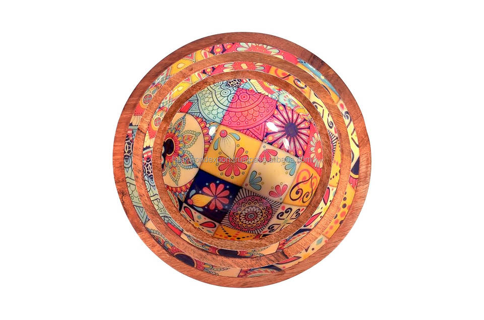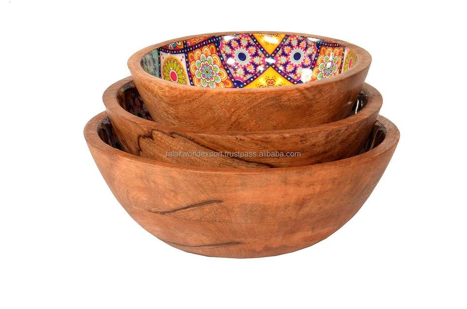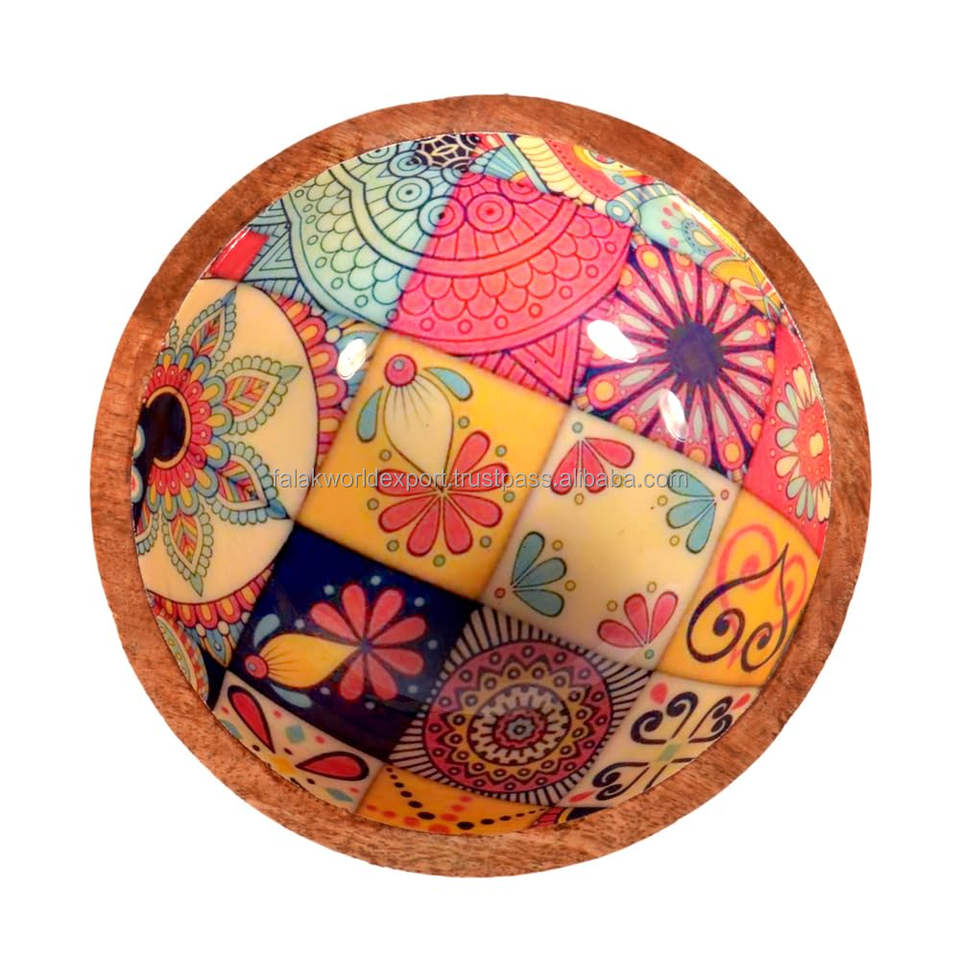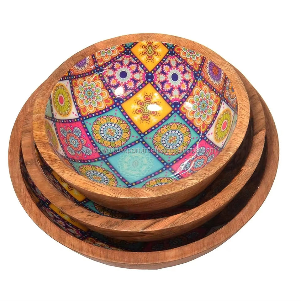 Hot Selling Mango Wood Printed Serving Salad Bowl Fancy Design for Party Wooden Fruit and Salad Serving Bowl By FWE