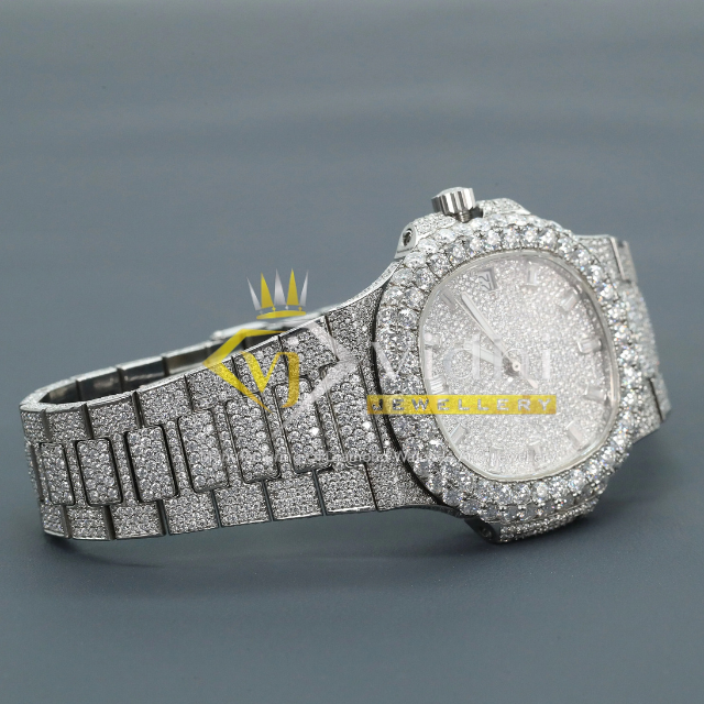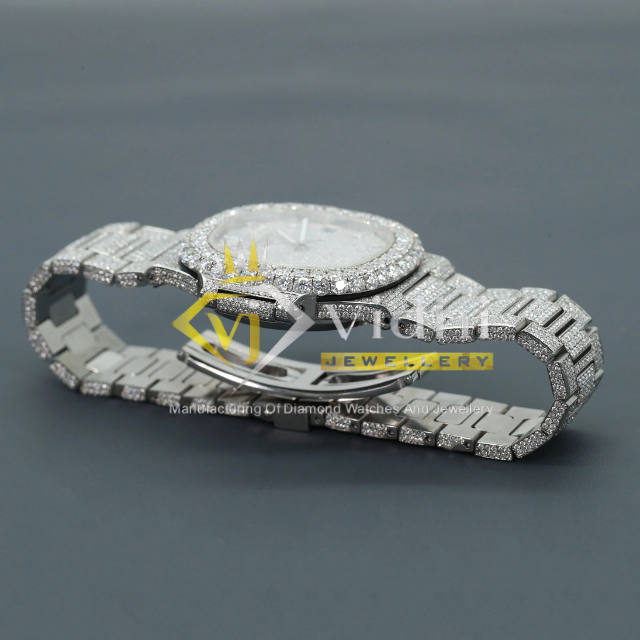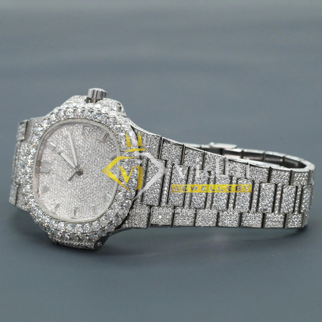 Hot Selling Men's Stainless Steel Watch Full Diamond Lab Grown Custom Iced Charm Smart Dial Glass Crown Hip Hop Style White Gold