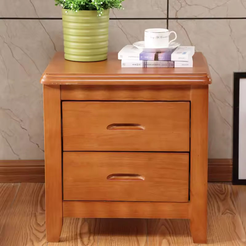 Hot Selling Modern Multi-function Natural Wood Solid Bedroom Furniture Nightstand Double Drawer Storage Durable Frame