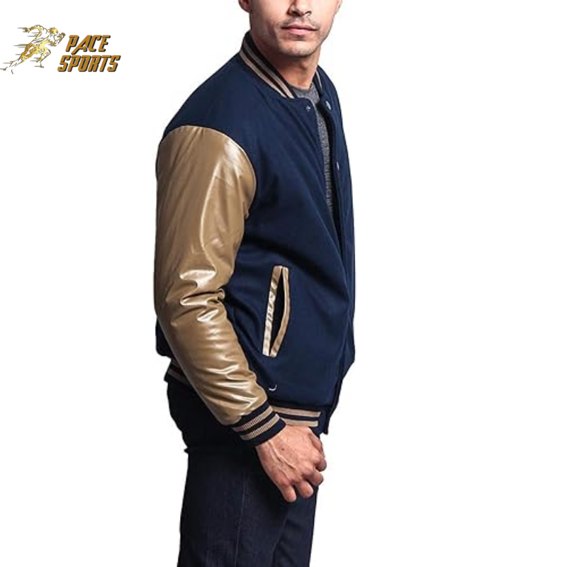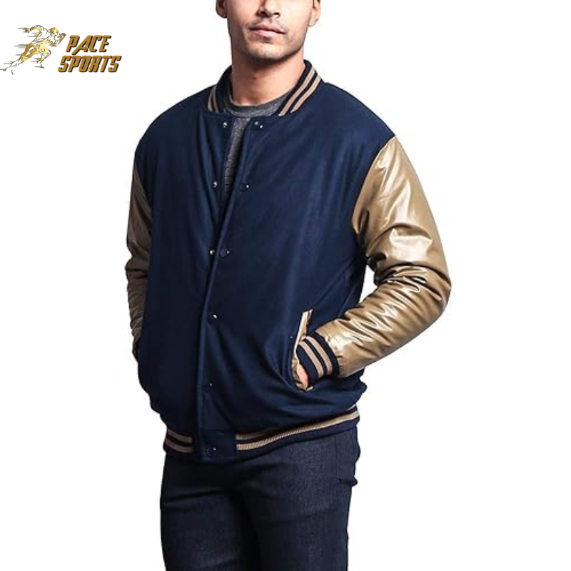 Hot Selling Premium Golden Leather Sleeve Blue Varsity Jacket with Stand Collar Front Logo Custom High Quality Wholesale Men's