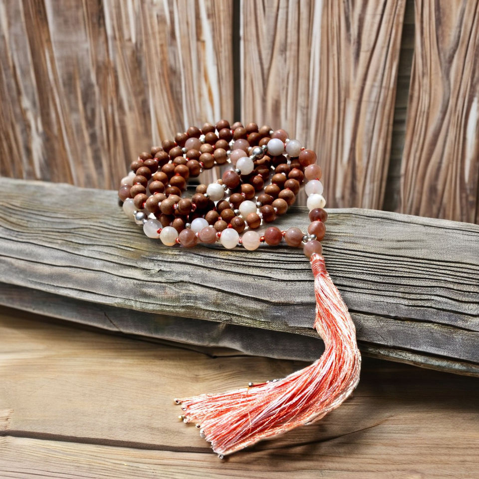 Hot Selling Peach Moonstone 8mm Beads High Quality Natural Sandalwood Long Mala 108 Prayer Beads Necklace Fashionable Style