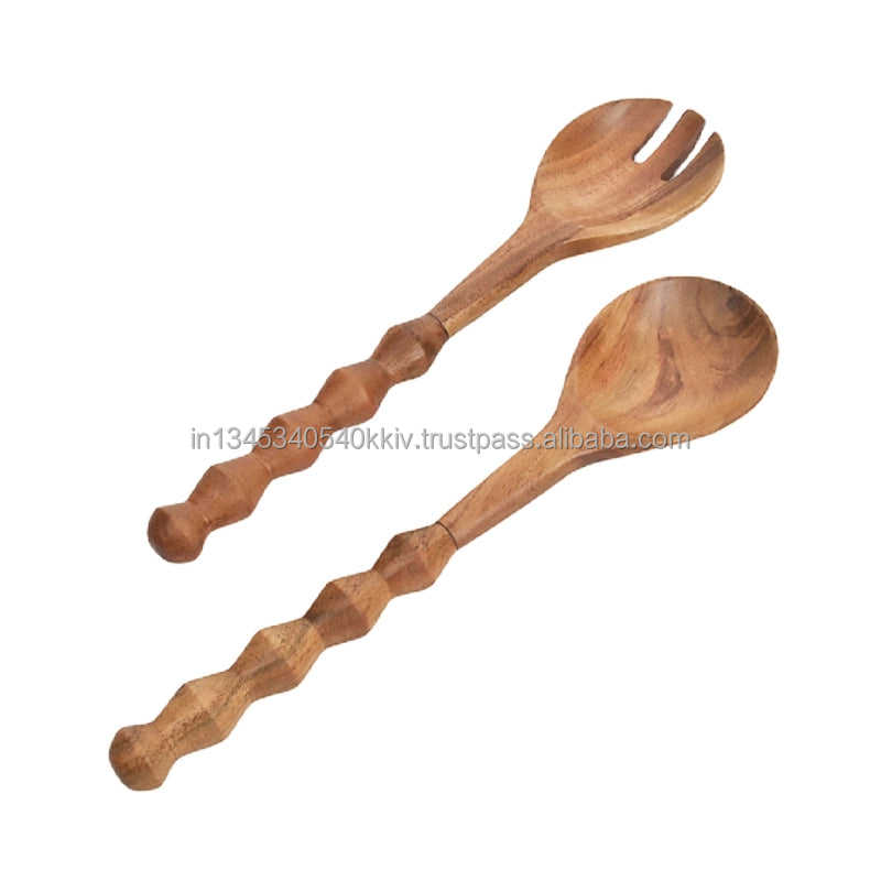Hot Selling Popular Style Long Handle Acacia Wood Serving Utensils Wooden Salad Tools Salad Server Set