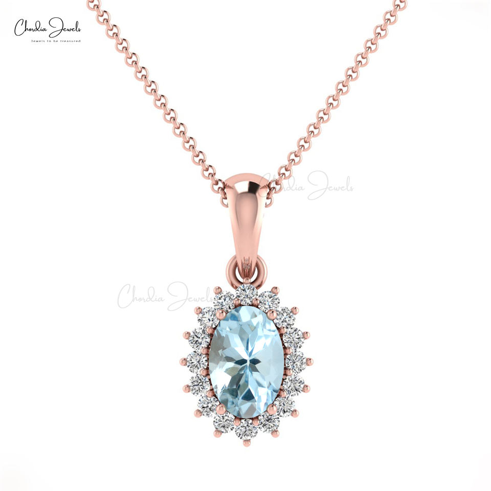 Hot Selling Product 6x4mm Oval Cut Brazilian Aquamarine Bridal Pendant 14k Fine Gold Diamond Halo Wedding Jewelry at Best Price
