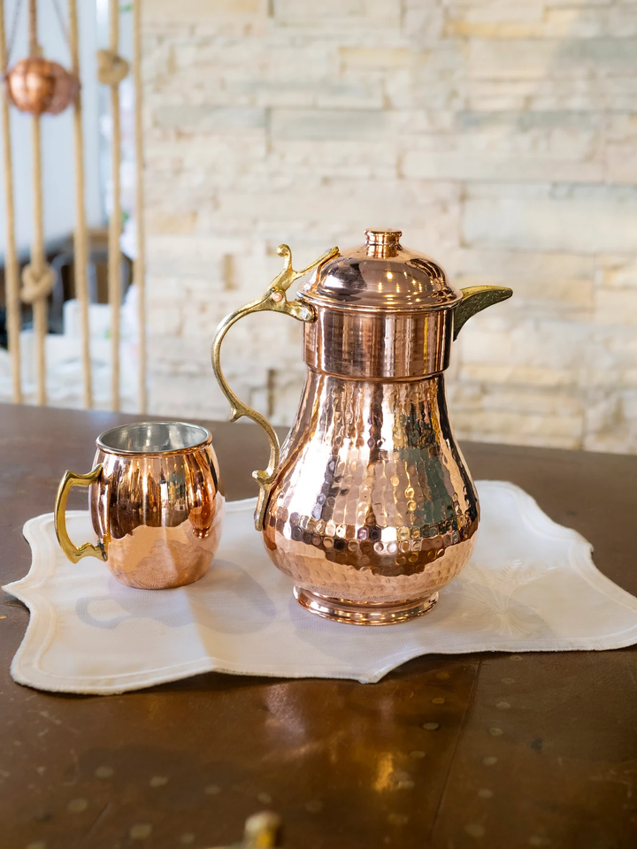 Hot Selling Pure Handmade Hammered Copper Water Pitcher Jug Carafe Dispenser With Glass Tumblers