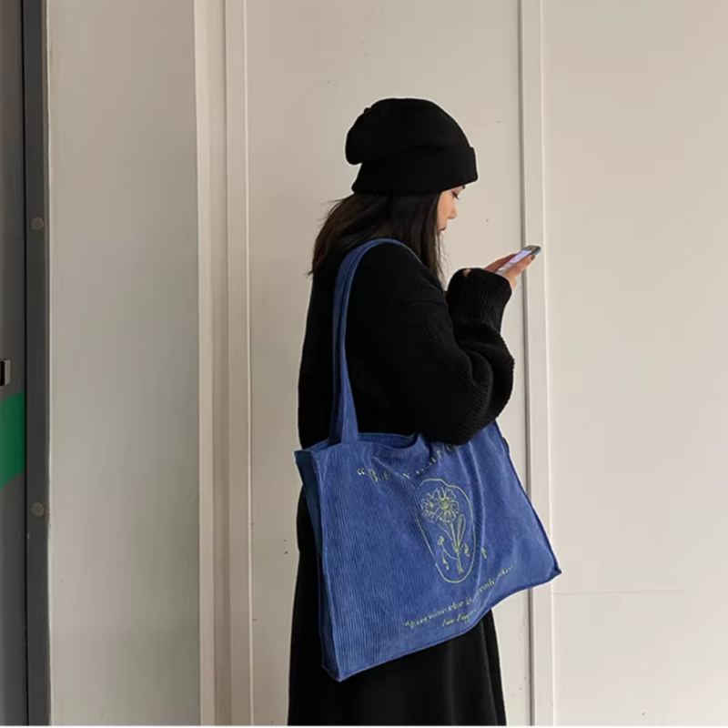 Hot Selling Soft Corduroy Tote Bag 16 Inches Blue Embroidery Logo Eco-friendly Portable Shopping Handbag for Women Daily Use
