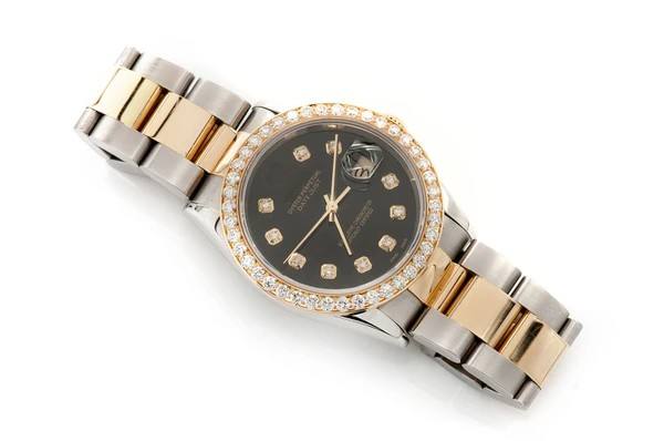 Two Tone Yellow White 1 Row On Bezel Black face Dial Round VVS Moissanite Stainless Steel Plain Daily Wear Watch for Women Wrist