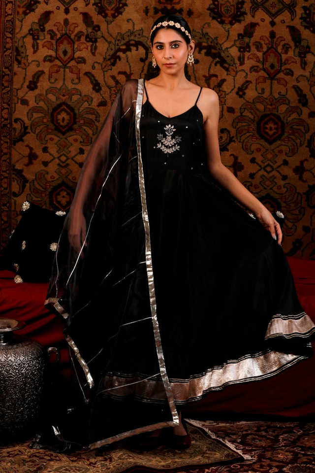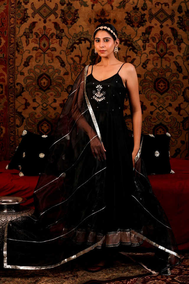 Hot Selling Stylish Strappy Anarkali Dress for Women Deep Black with Gota Patti Embroidery for Party Celebration
