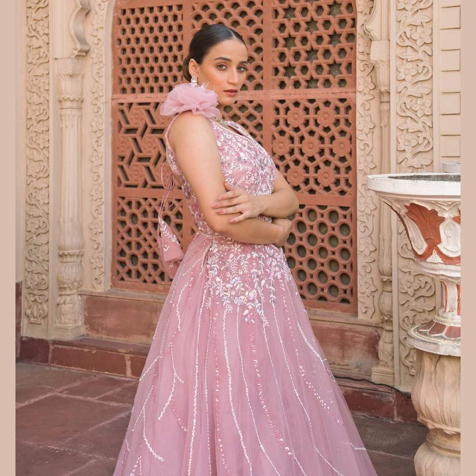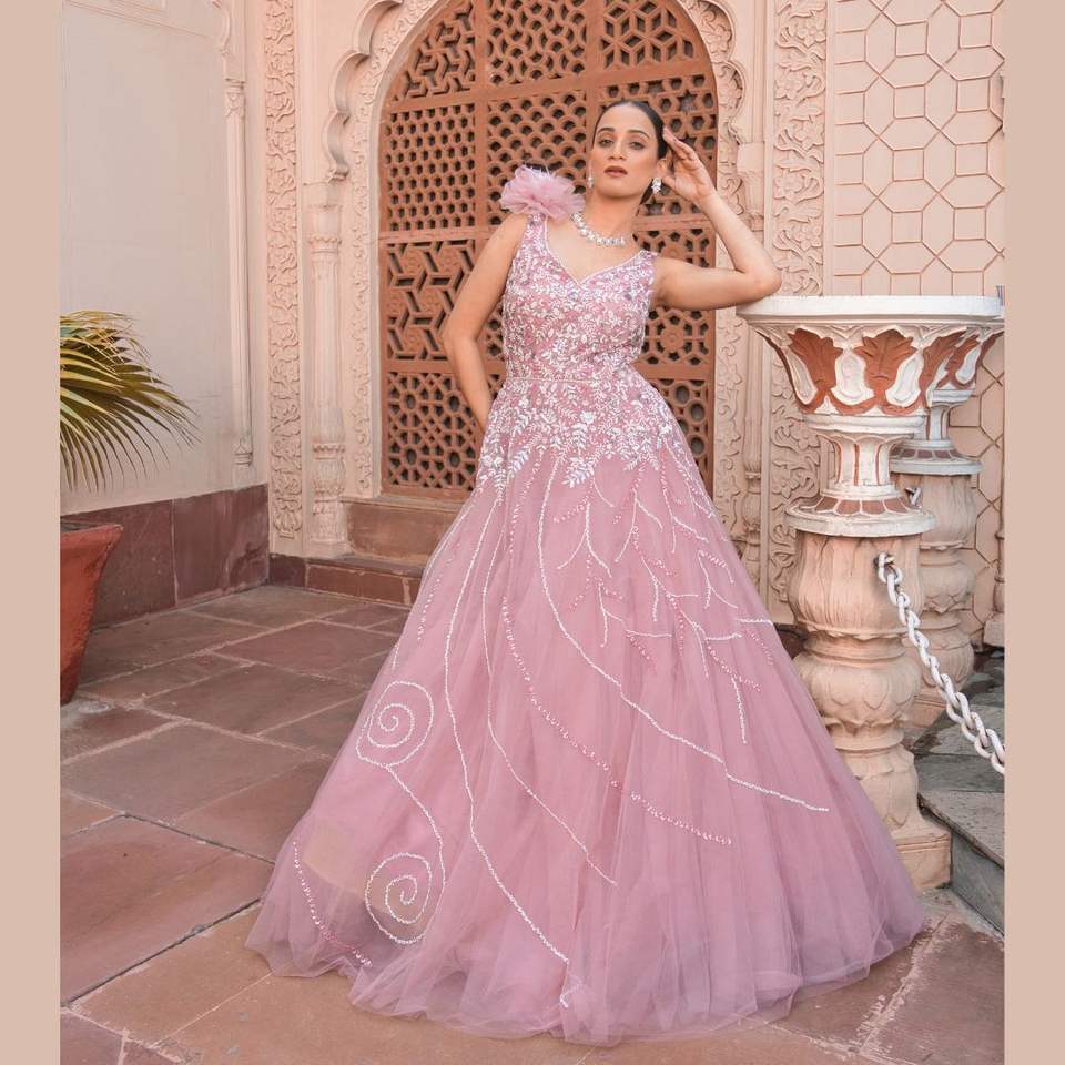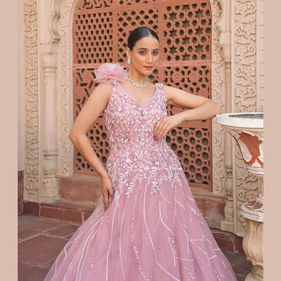 Hot Selling Traditional Wedding Dress for Women Pink Gown with White Handwork & Pearls for Parties or wedding wear from india
