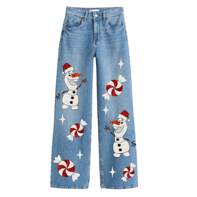 Hot Selling Trendy Christmas Custom Embroidered High Waist Loose Fit Denim Jeans for Women New Arrival Wide Leg Pants Wholesale