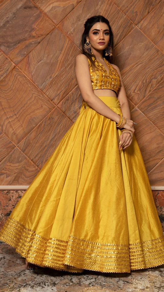 Hot Selling Trendy Rabia Yellow Cotton Silk Lehenga with Lace Work and Organza Dupatta Set For Wedding Party Wear
