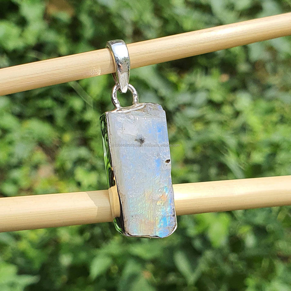 Natural Rainbow Moonstone Rough 925 Silver Pendant for Necklace