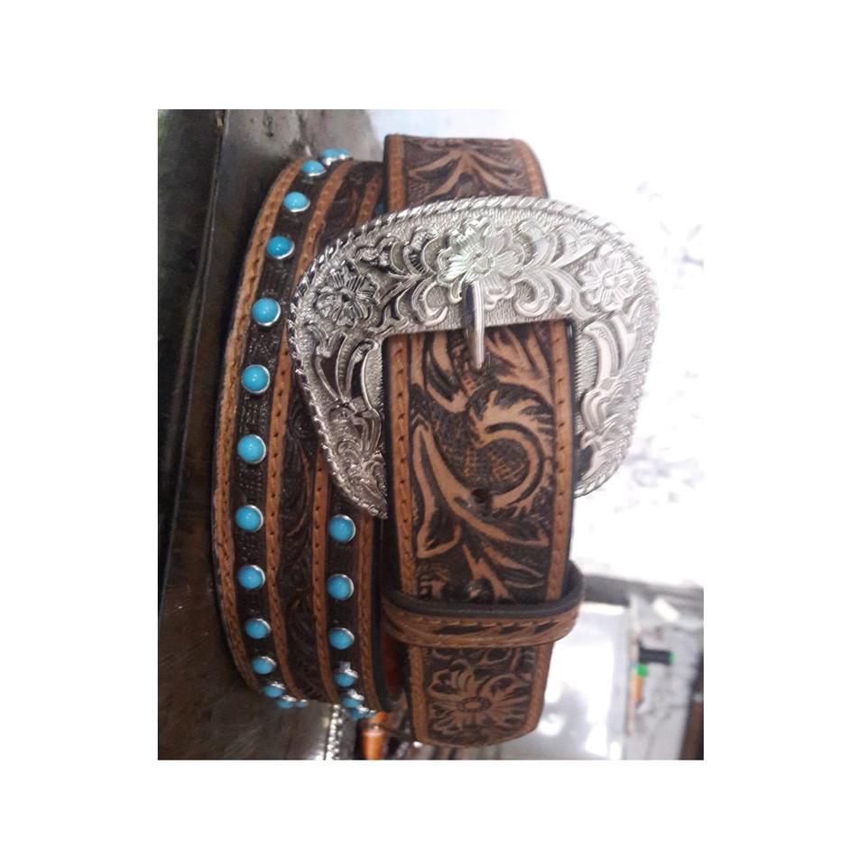 Hot Selling Unisex Floral Tooled Blue Studs Leather Belts Durable Beaded Belts with Fancy Buckles Customized Horse Products
