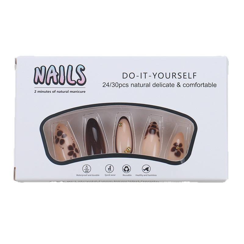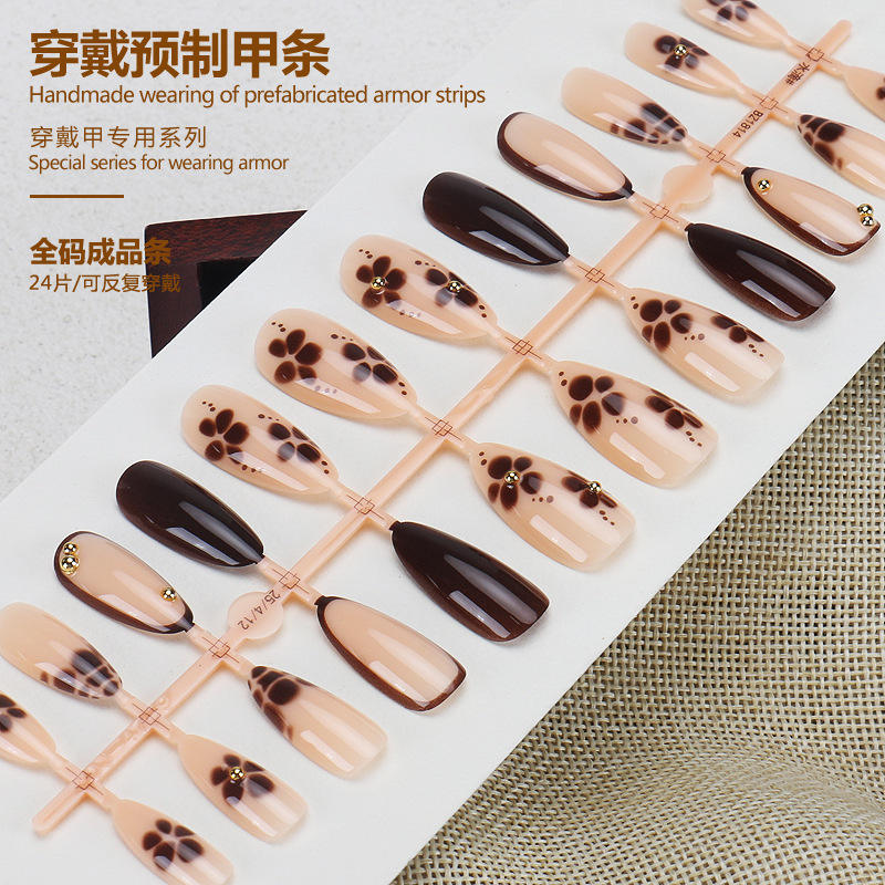 Hot-Selling Wearable Elegant Nude Brown Flower Gold Bead Embellishment Detachable Fake Nails European and American Cross-Border