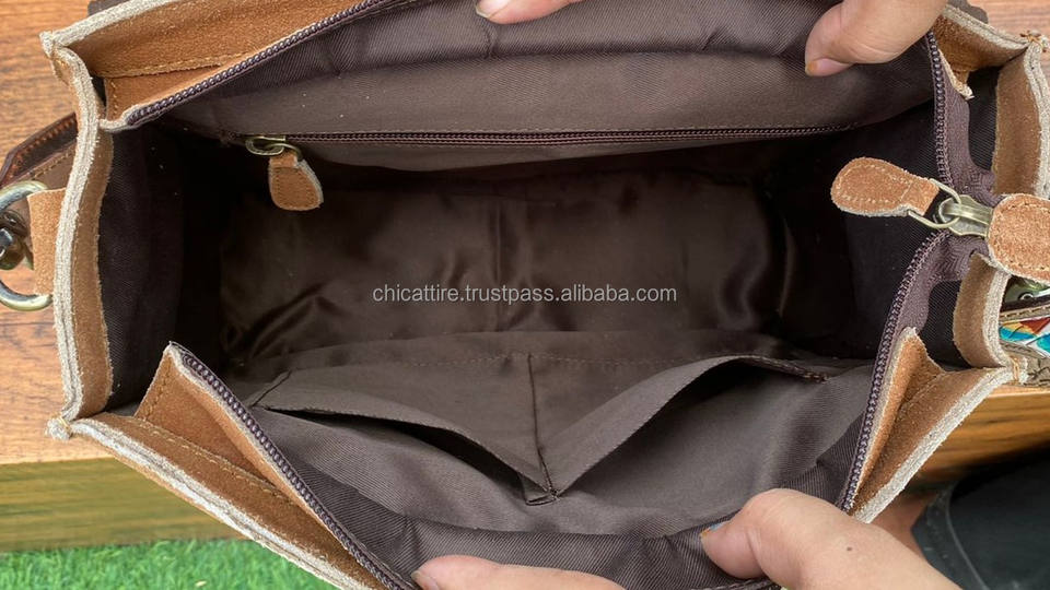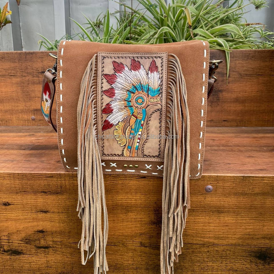 Hot Selling Western Patterned Hand Tooled Suede Leather Concealed Carry Fringe Crossbody Bag for Women Carving Messenger Bag