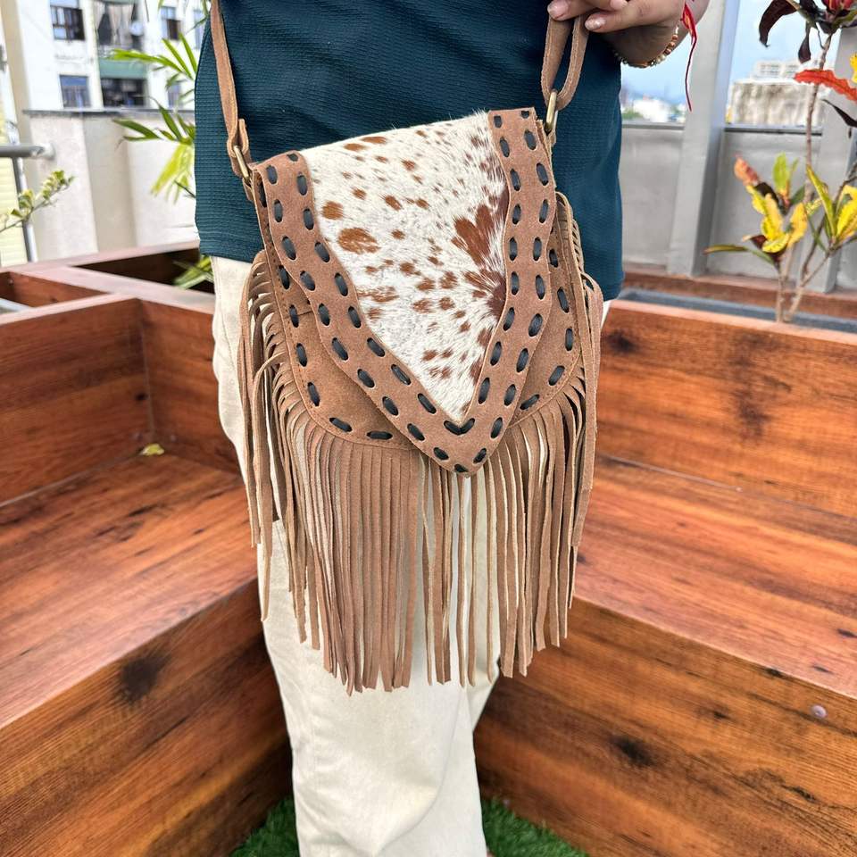 Hot Selling Western Real Hair on Suede Leather Fringe Crossbody Bag for Women's Custom Genuine Leather Hand Stitch Purse