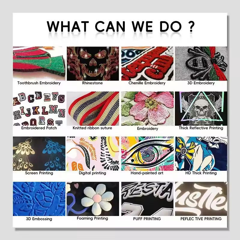 Printing Methods:Discharge Printing, Puff Printing, Embossed, Heat-Transfer Printing, Digital Printing, Silk Screen Printing, Sublimation Transfer Print, Glitter Print, silicone printing, WATERMARK, Laser Printing, reflective printing