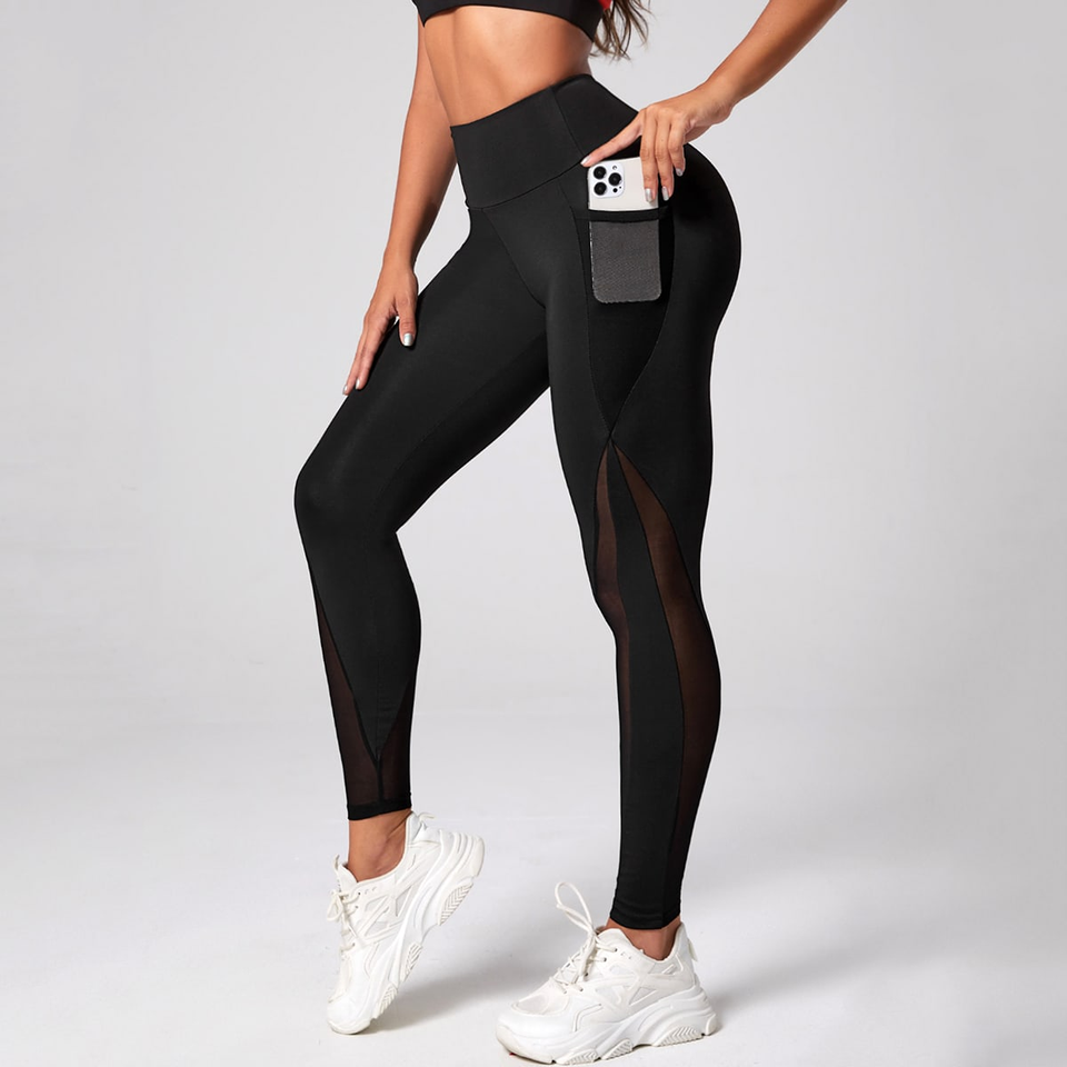 Hot Selling Women's Black Slim Fitness Leggings High Waist Tummy Control Unique Sexy Mesh Knitted Push-up Legging Side Pocket