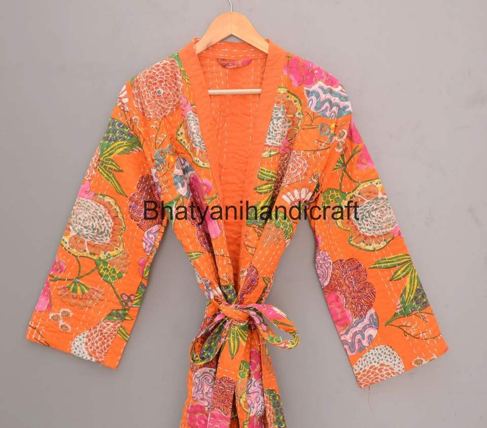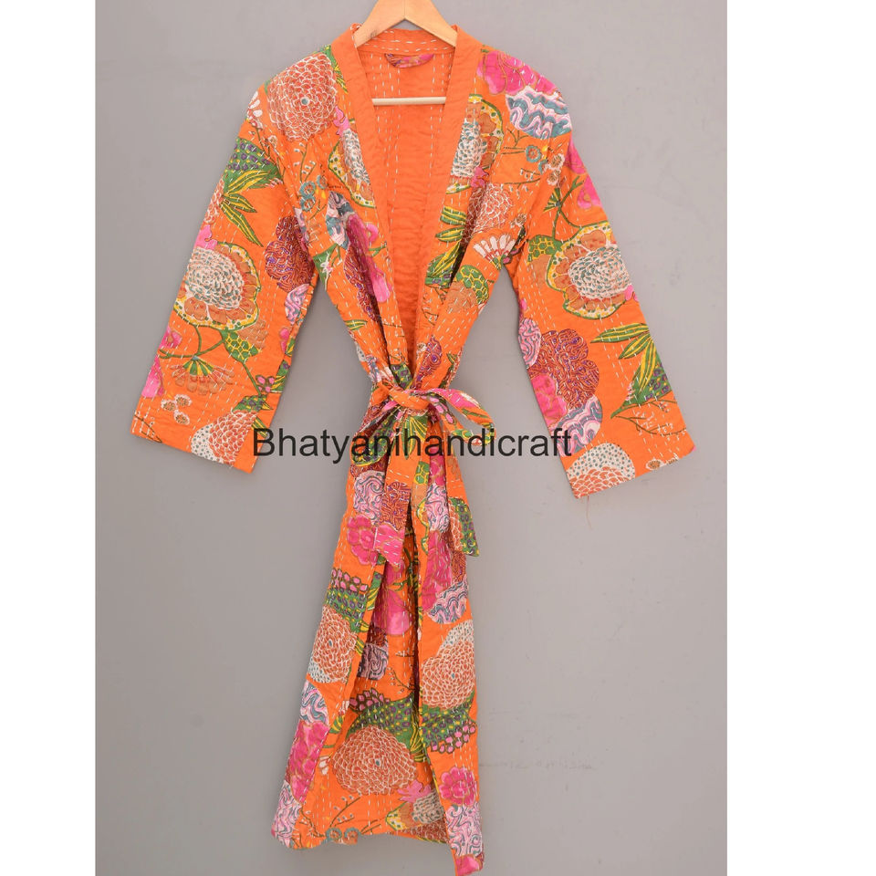 Hot Selling Women's Long Cotton Kantha Robe Jacket Floral Quilted Beach Wear Dress with Belt Closure for Winter