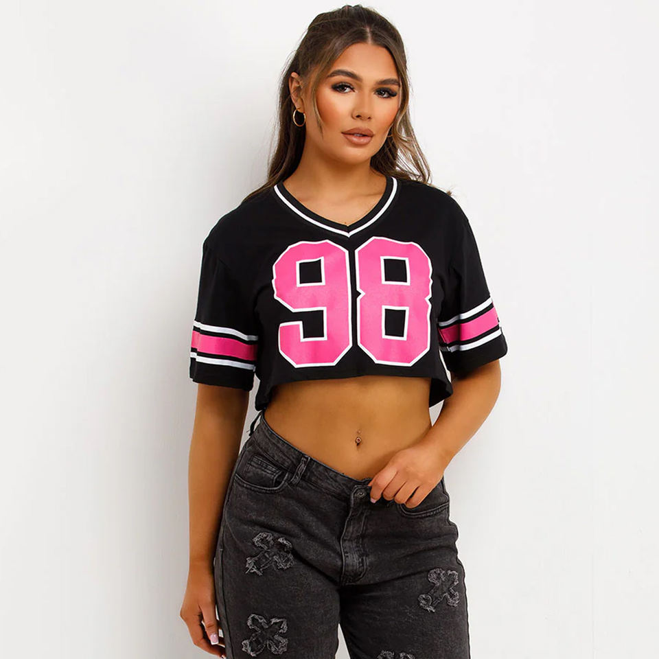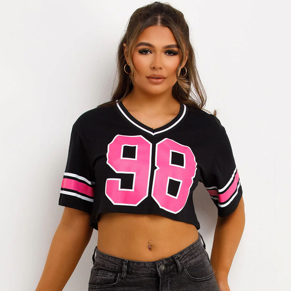 Hot Selling Women's V-Neck Crop Sports Jersey 98 Pink Knitted Fabric Custom Logo Tops Fashionable Tee Shirt Logo Tags Available