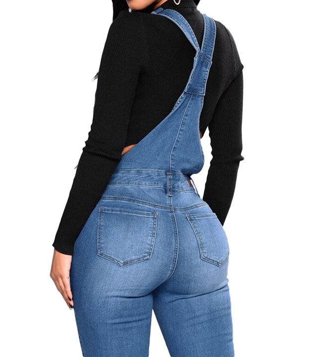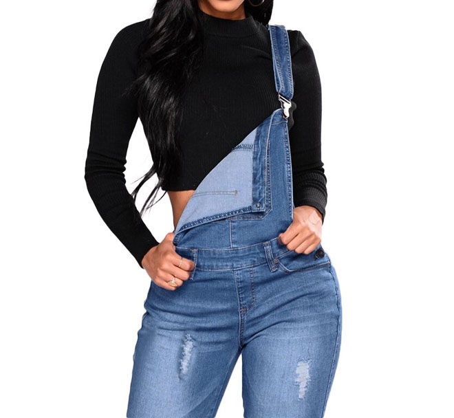Hot Selling Women's Winter Washed Denim Dungarees with Button Detail Vintage Casual Ripped Overall Jumpsuits