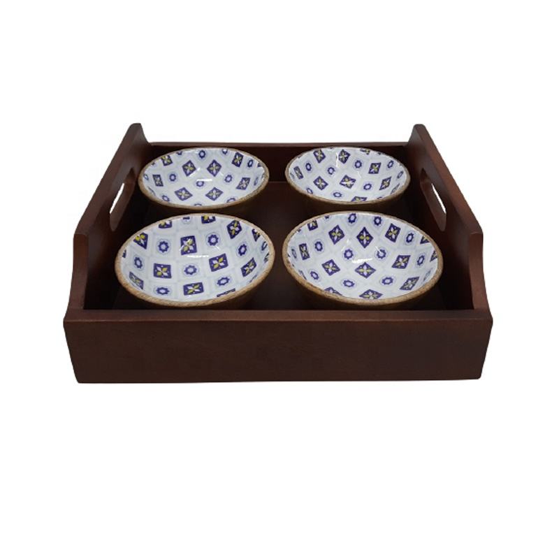 Hot Selling Wooden Square Shaped Tray With Four Bowl Medium Size Sticker Enamil Finishing Customized in Bulk