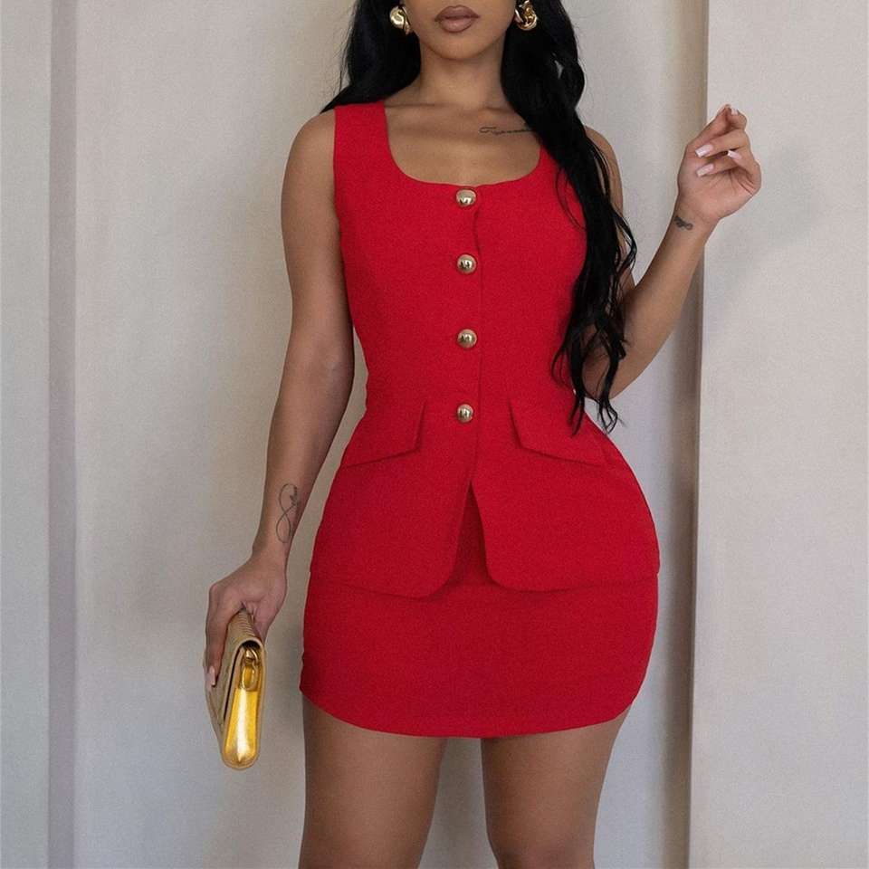 Hot Style Solid Color Sleeveless Button up Mini Top and Skirt Women Set Fashion
