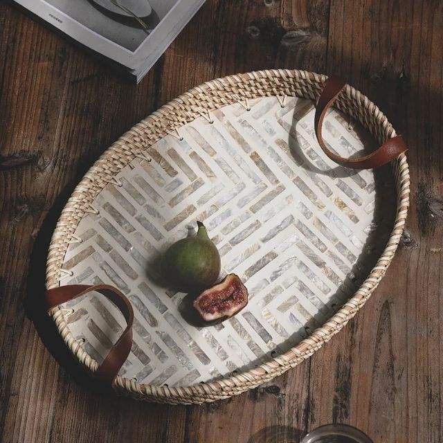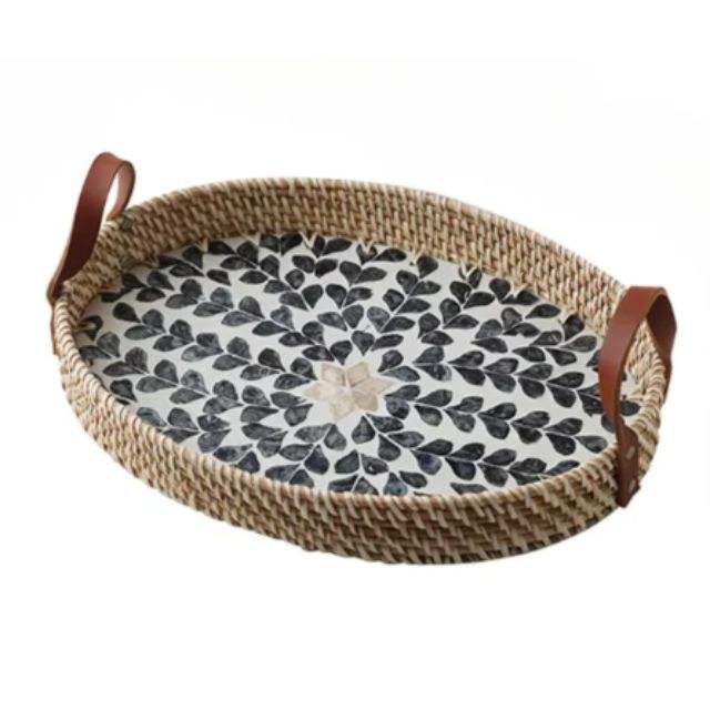 Rattan MOP Oval Tray With Leather Handle Variety DesignProduct Name