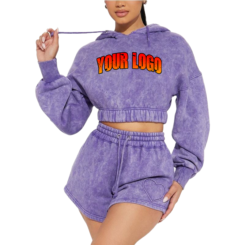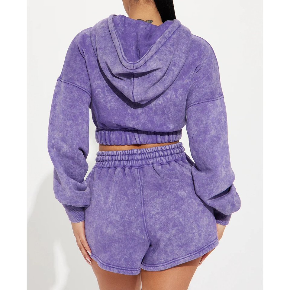 Hot Trending Purple Vintage Sweat Suit for Women Custom Wholesale Cropped Pullover Lace Knee Washed Hoodies Shorts 2 Piece Set