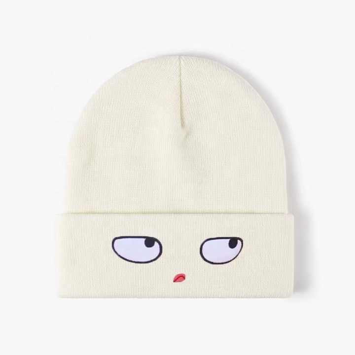 Hot Trendy Cute Beanies Cartoon Face Embroidered White Beanie Knitted Hat for Autumn Winter Warm Beanies Christmas Knitted Hat