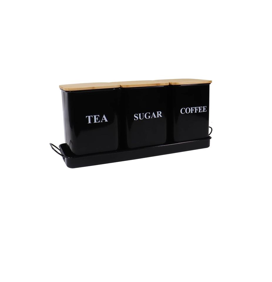 Hot Vantage Modern Canister Set of 3 Metal Storage Tin for Coffee Sugar & Tea Kitchen Storage Jars with Wooden Lid & Metal Tray