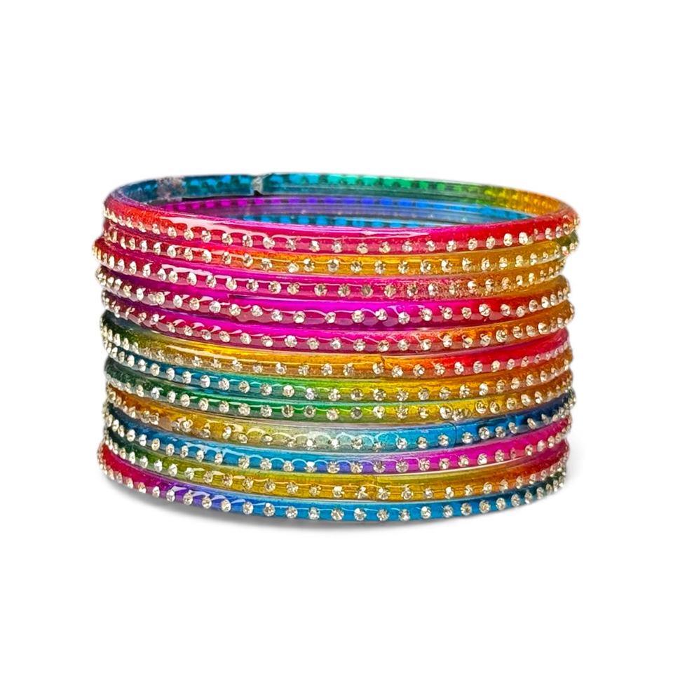 Hot Vibrant Rainbow Multi-Color Trendy Wedding Pearl Glass Bangle Set with Clear Stone Accents Wholesale Bulk
