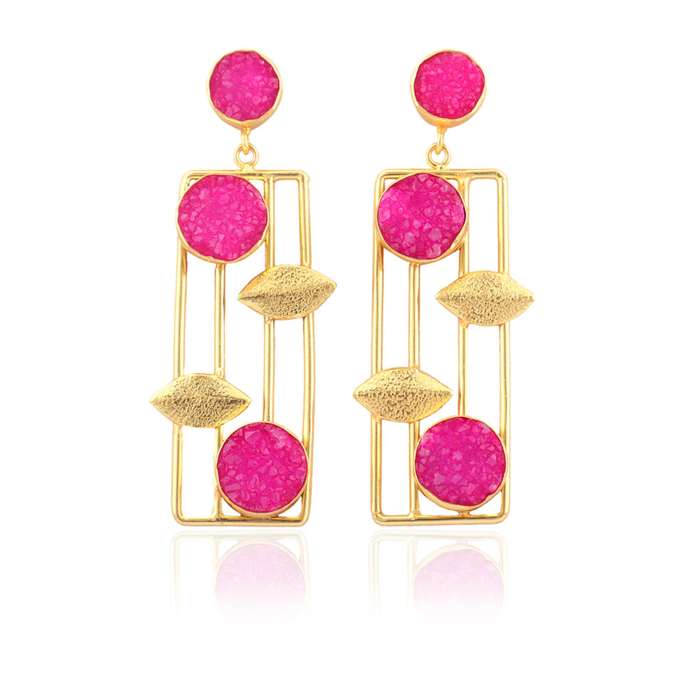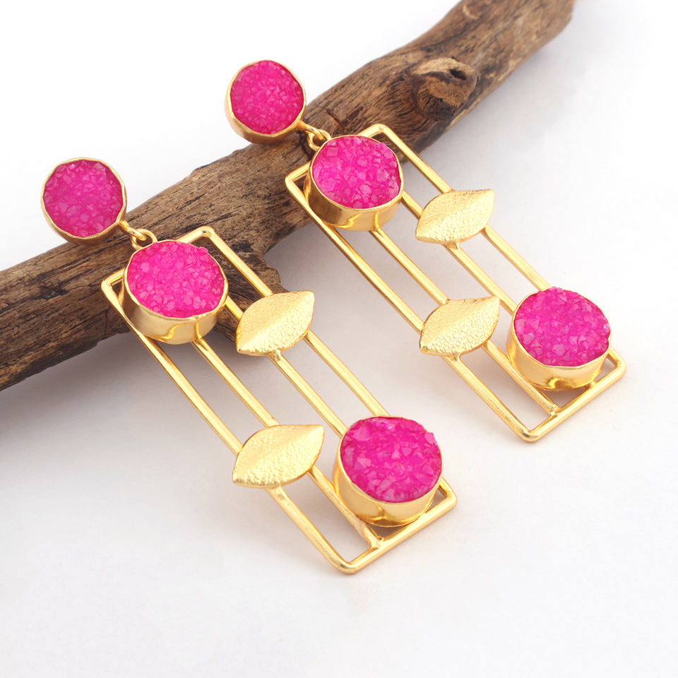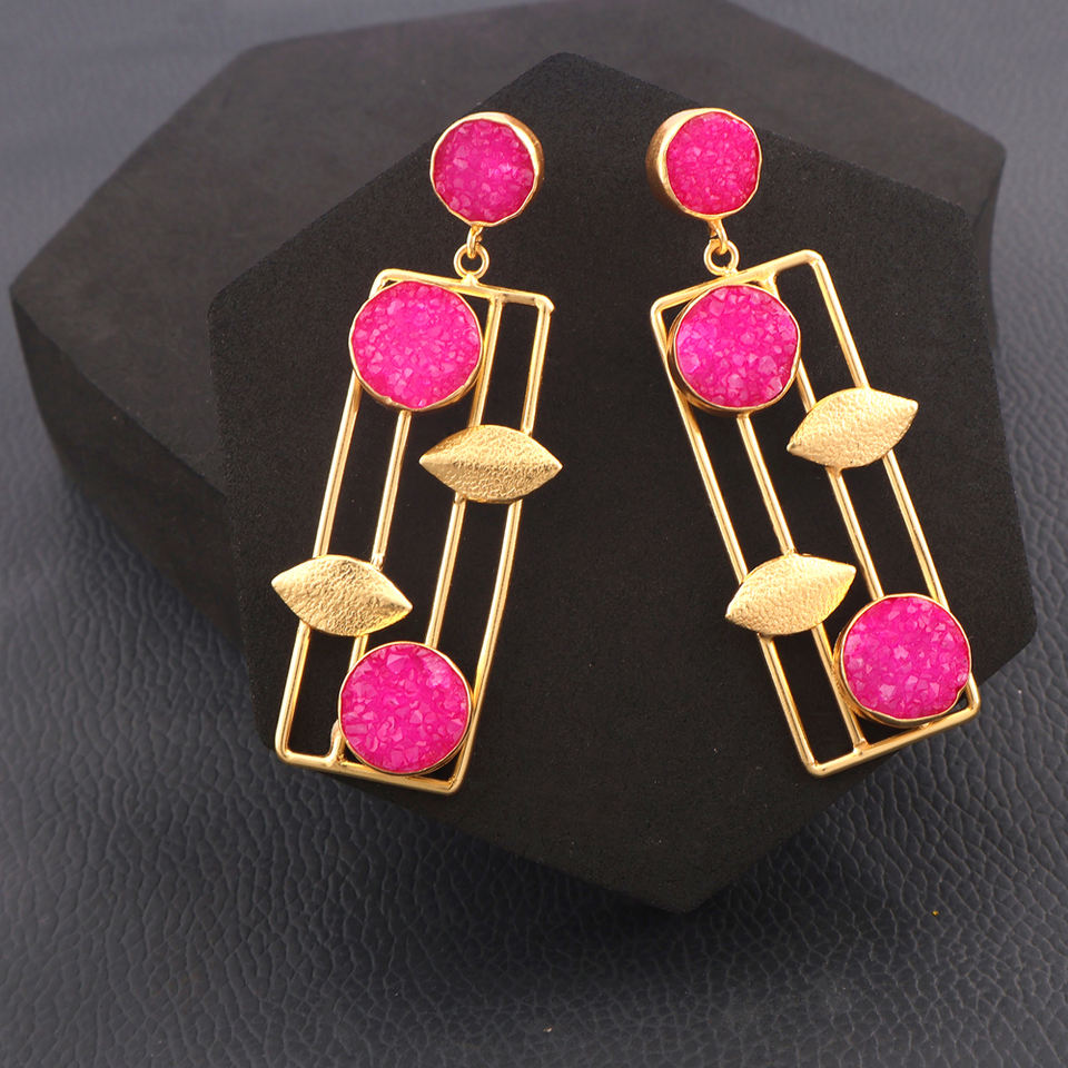 Hot pink Bridesmaid Earring Natural Shimmering Sugar Druzy Stud Dangler Solid Brass Gold Plated Texture Leaf Shape Designer Drop