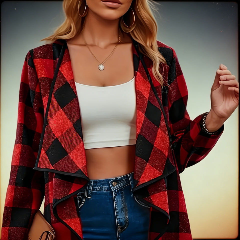 Hot sale on Temu Ladies Red And Black Plaid Print Drape Front Coat Loose Fit Lightweight For Spring Autumn Everyday Outfits
