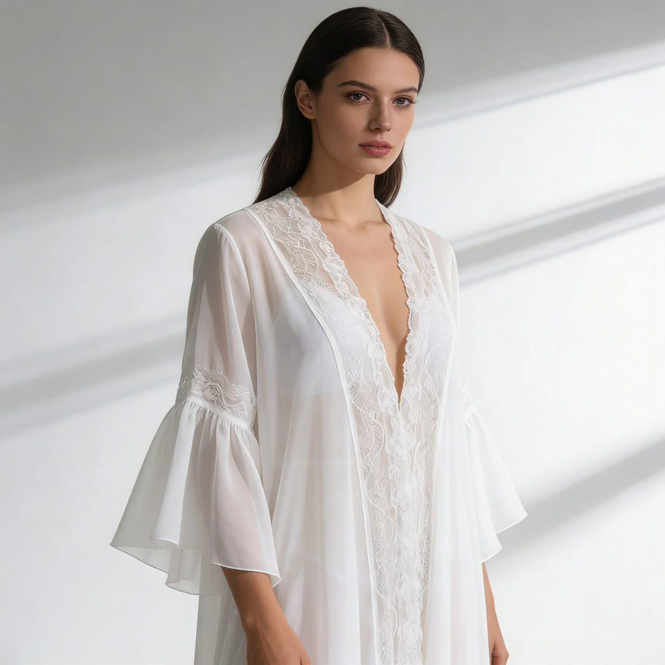 Hot sale on Temu Ladies White Long Bridal Dress Lace Trim Bell Sleeve Open Front Dress For Wedding Preparation And Honeymoon