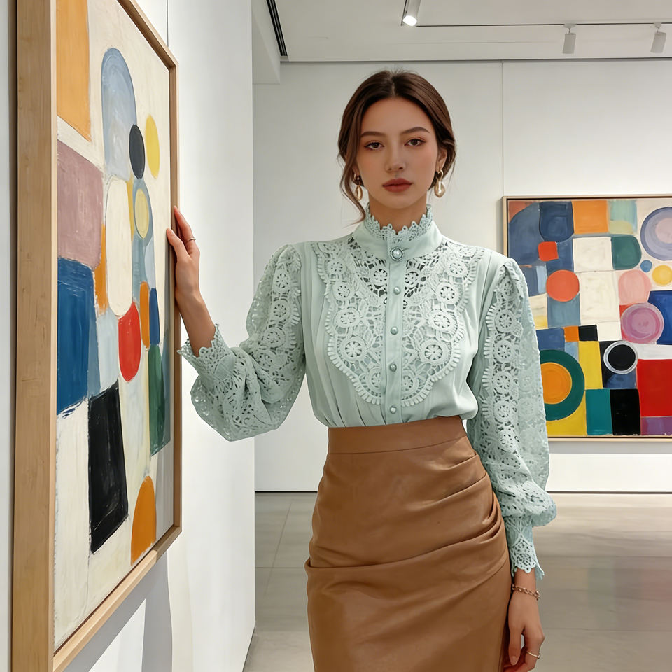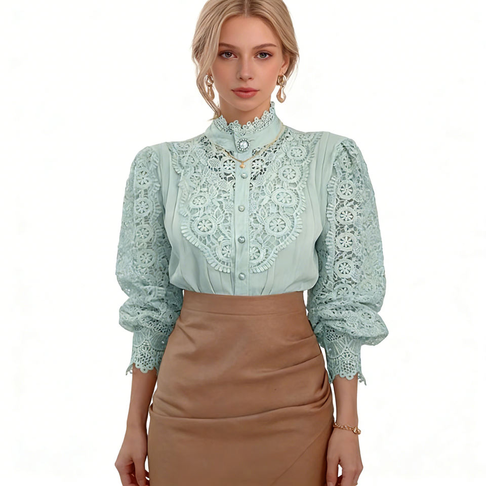 Hot sale on Temu | Retro Stand Collar Lace Blouse Women's Puff Sleeve Hollow Out Shirt Casual Commuting Elegant Top