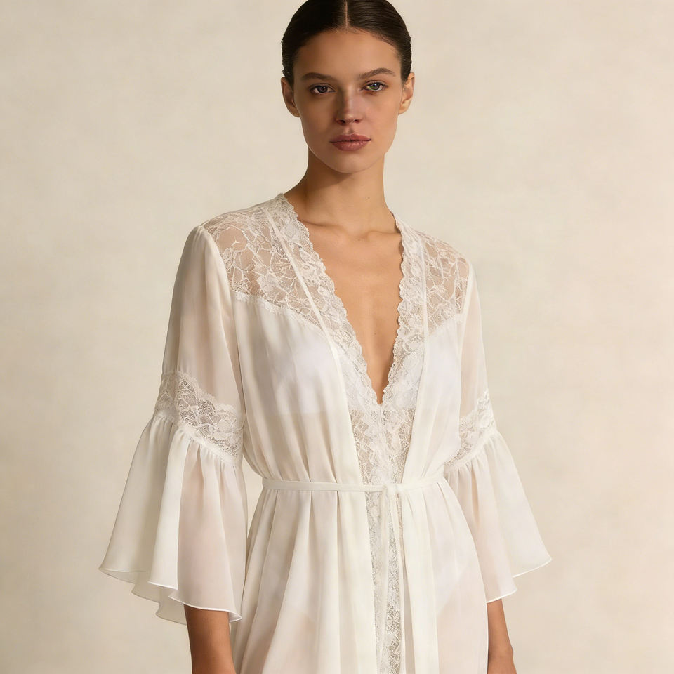 Hot sale on Temu Women Elegant White Long Bridal Dress With Lace Trim Bell Sleeve Open Front Dress For Wedding Honeymoon