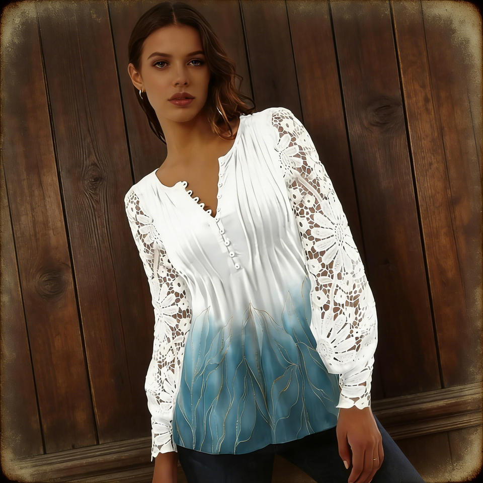 Hot sale on Temu chic white blue gradient print blouse with hollow lace long sleeves v neck buttoned top