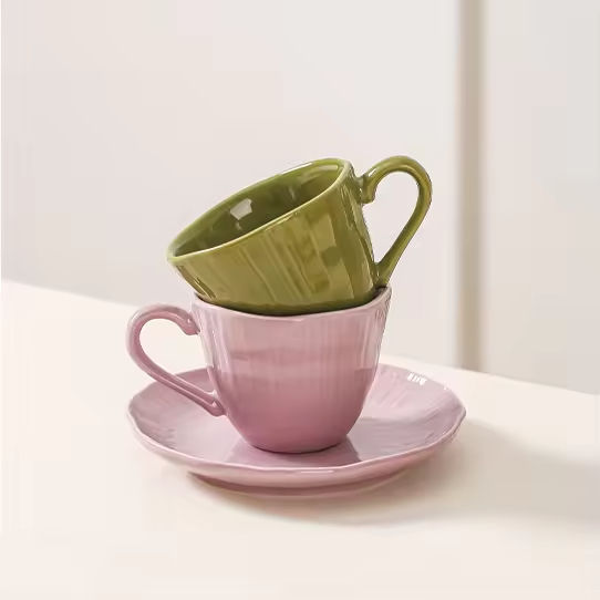 Hot sale solid color olive green light purple ceramic coffee cup with handle and saucer set
