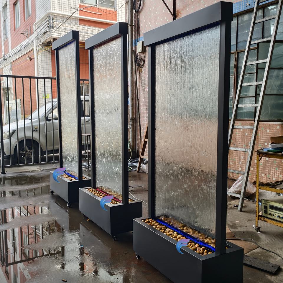 Hot sale wall mounted waterfall fountain in glass panel and stainless steel frame with led light for home decoration