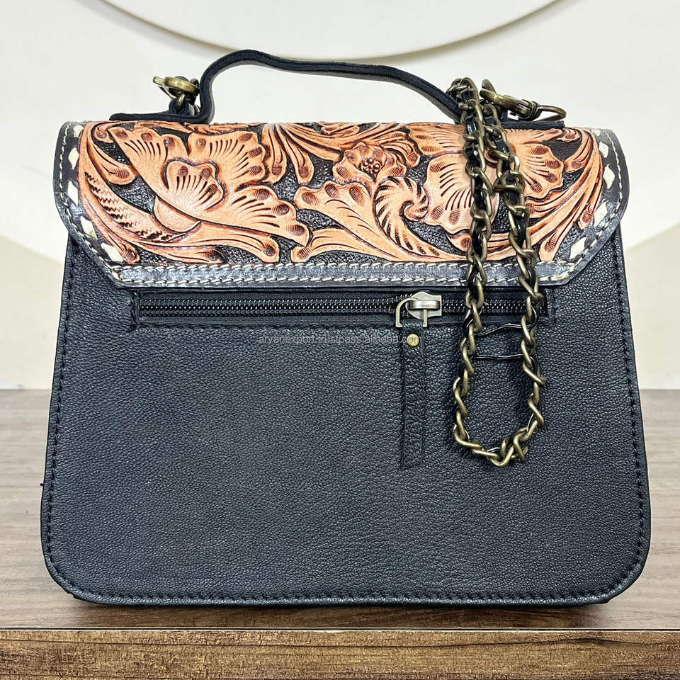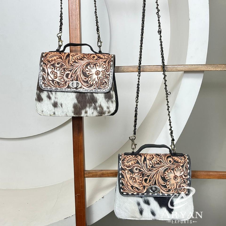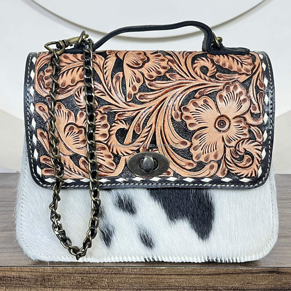 Hot selling Western Hand Tooled Cowhide Genuine Leather Handbag for Women Designer Crossbody with Chain Strap Vintage Sling Bag