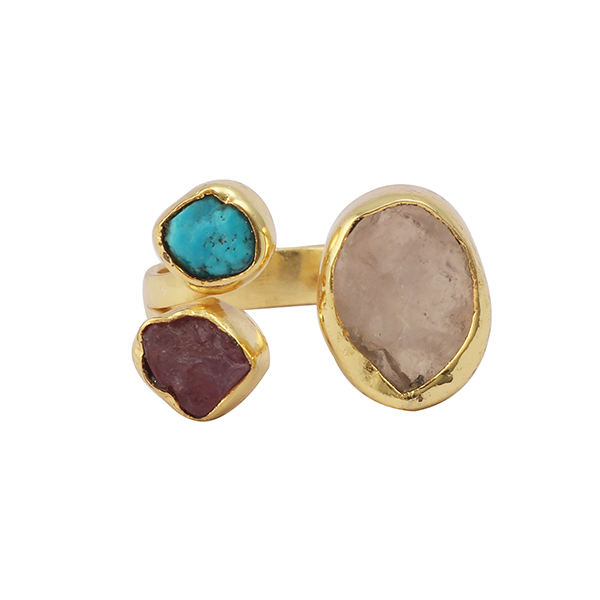 Hot Selling Brass Raw Aquamarine Three Gemstone Front Open Handmade Gold Plated Rough Ring Anniversary Gift