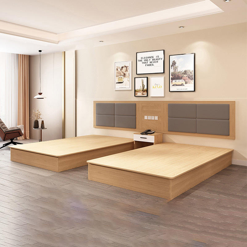 Hotel Bedroom Furniture Set Twin Double King Queen Size Options Cheap Wooden Platform Bed Frame with Headboard and Nightstand