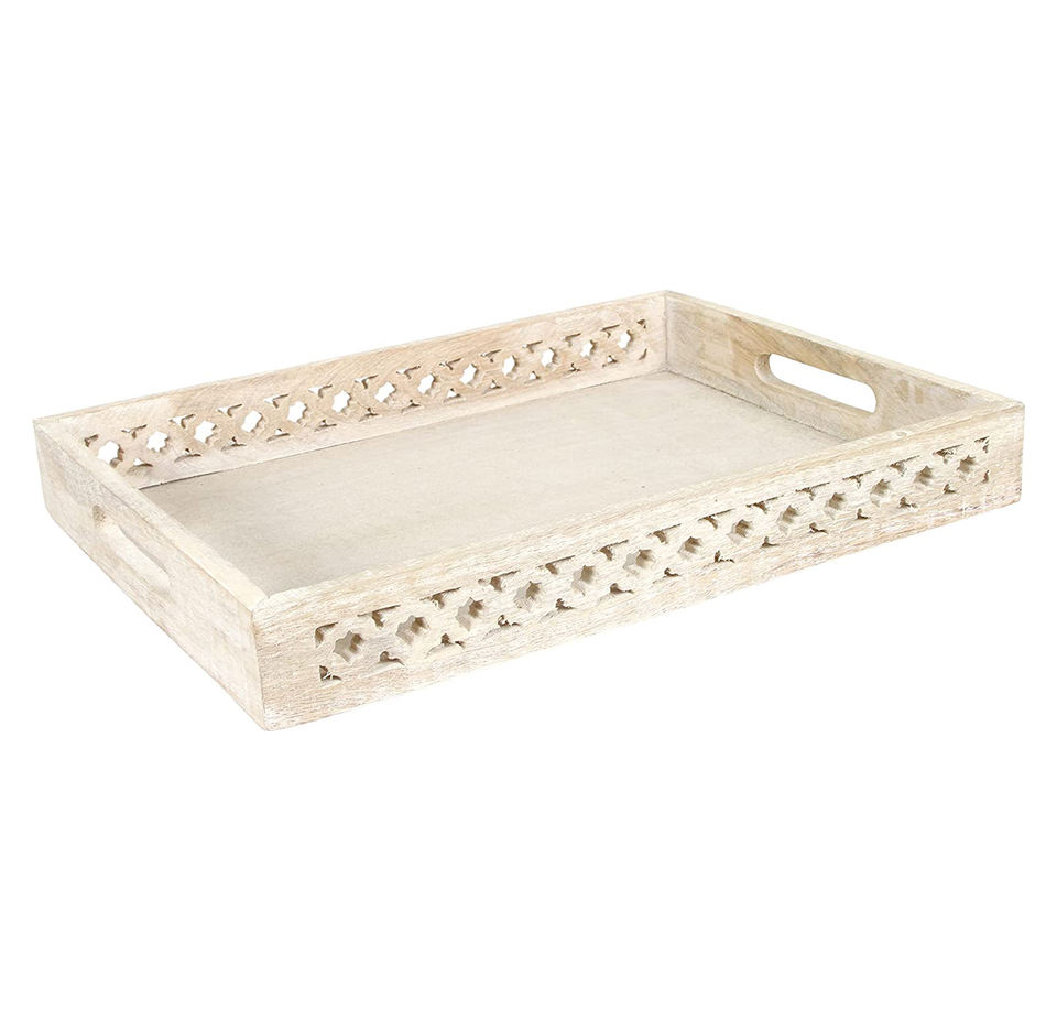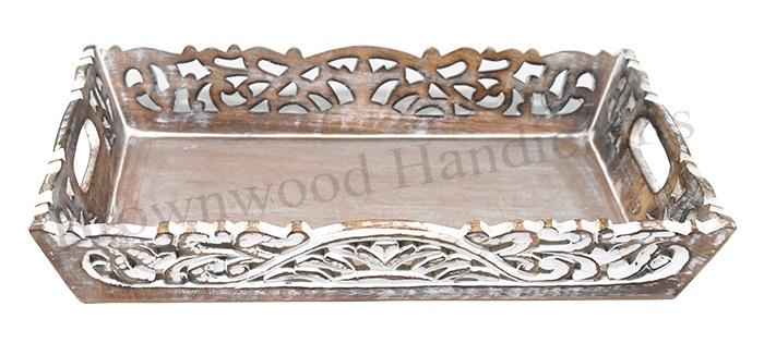 Hotel and Restaurant Supplies Rectangular Hand Carved Wooden Tray Set Mango Wood Food Serving Trays Set of 2 with Handles