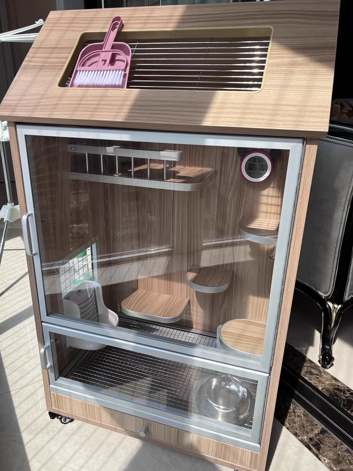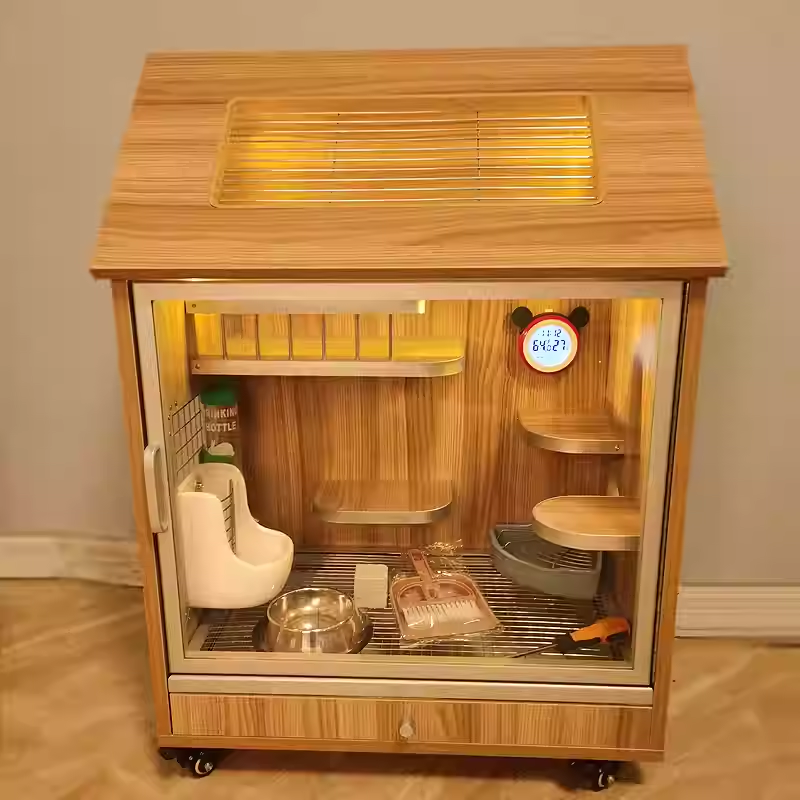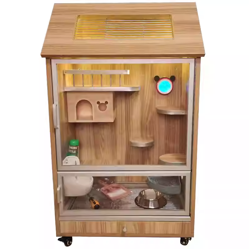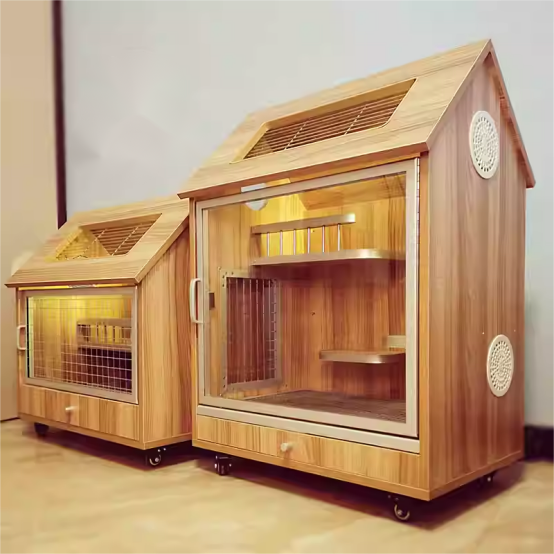 House-Shaped Wooden Cat Villa with LED Light Multi-Level Cat Condo with Wheels & Feeding Area Customized Wooden Cat house