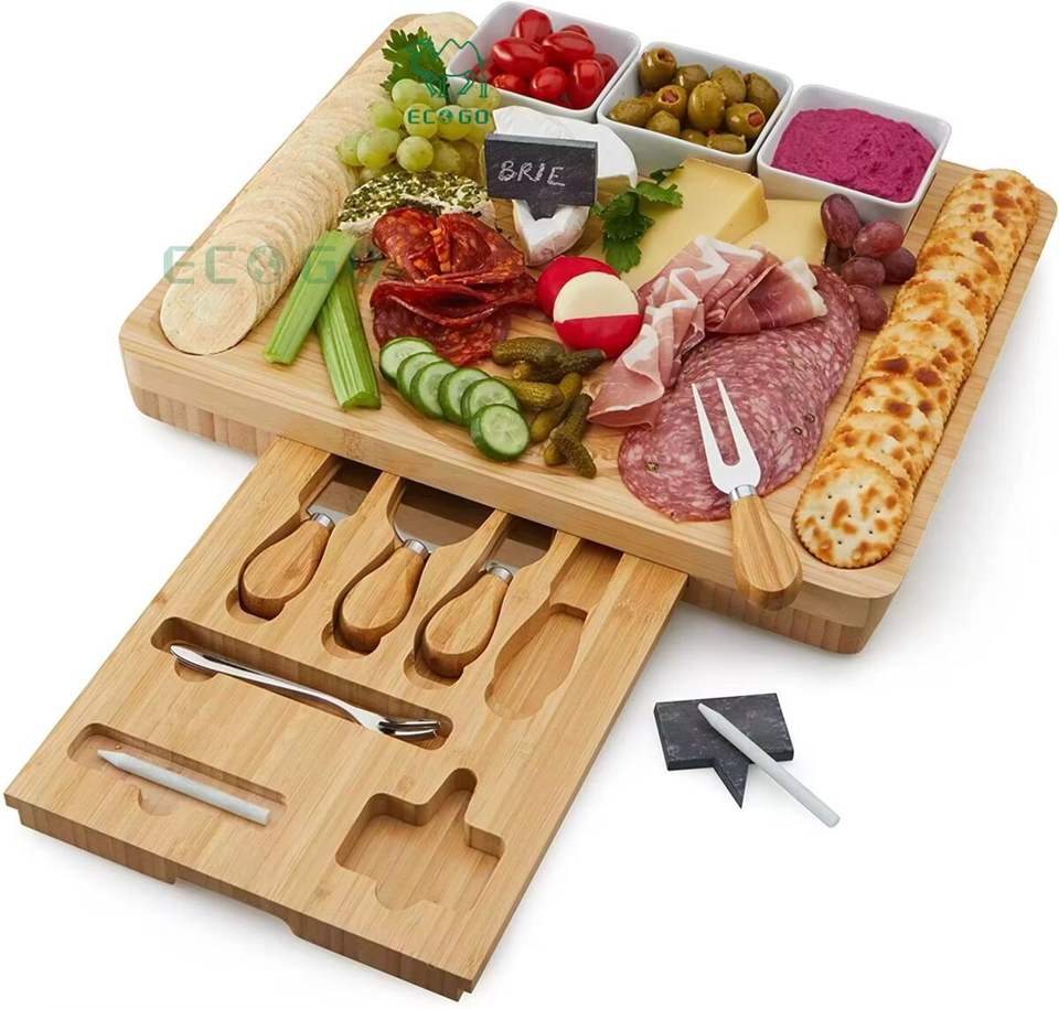 House Warming Gifts Bamboo Charcuterie Serving Platter Cheese Board With Knife Set and Sauce Bowls