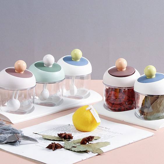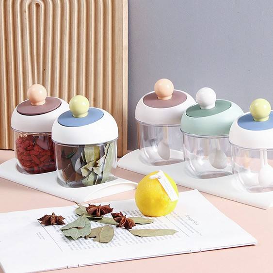 Household Kitchen Spice Jar Set With Spoon Airtight Plastic Lid Solid Seasonings Storage Container M Size Cover Design