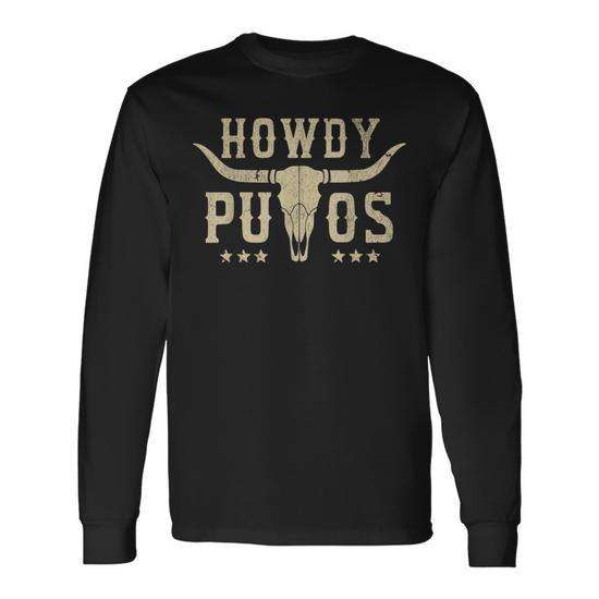 Howdy Putos Bull Skull Long Sleeve T-Shirt Country Cowboy Retro Vintage Design