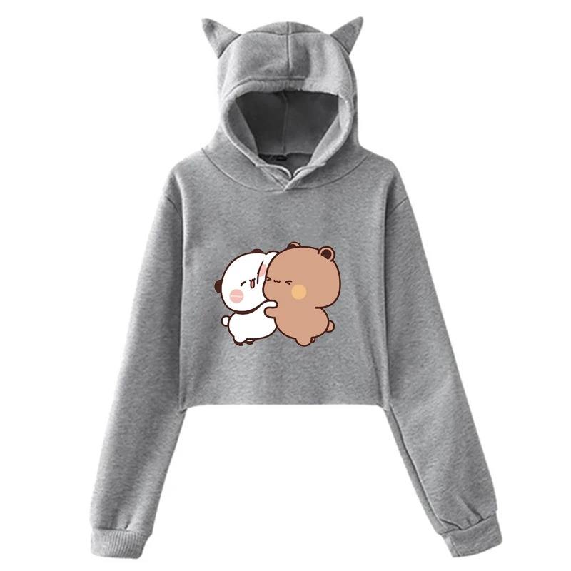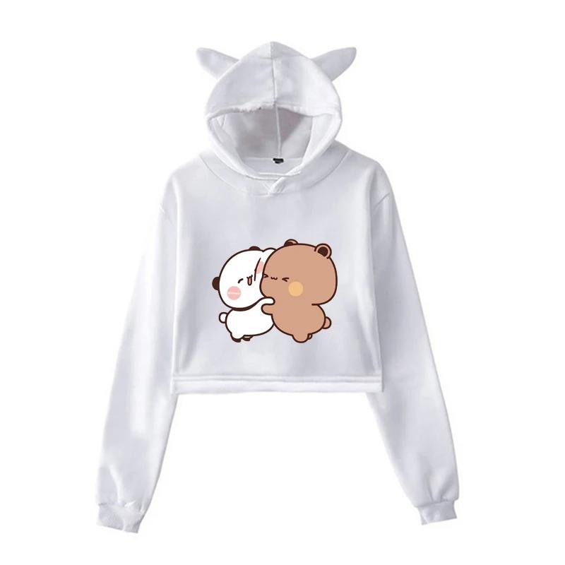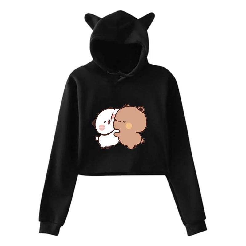 Hug Bear Print Graphic Printed Hoodie Women Fashion Kawaii Knitted Cropped Cat Ear Pullover Casual Long Sleeve Y2k Sweatshirt