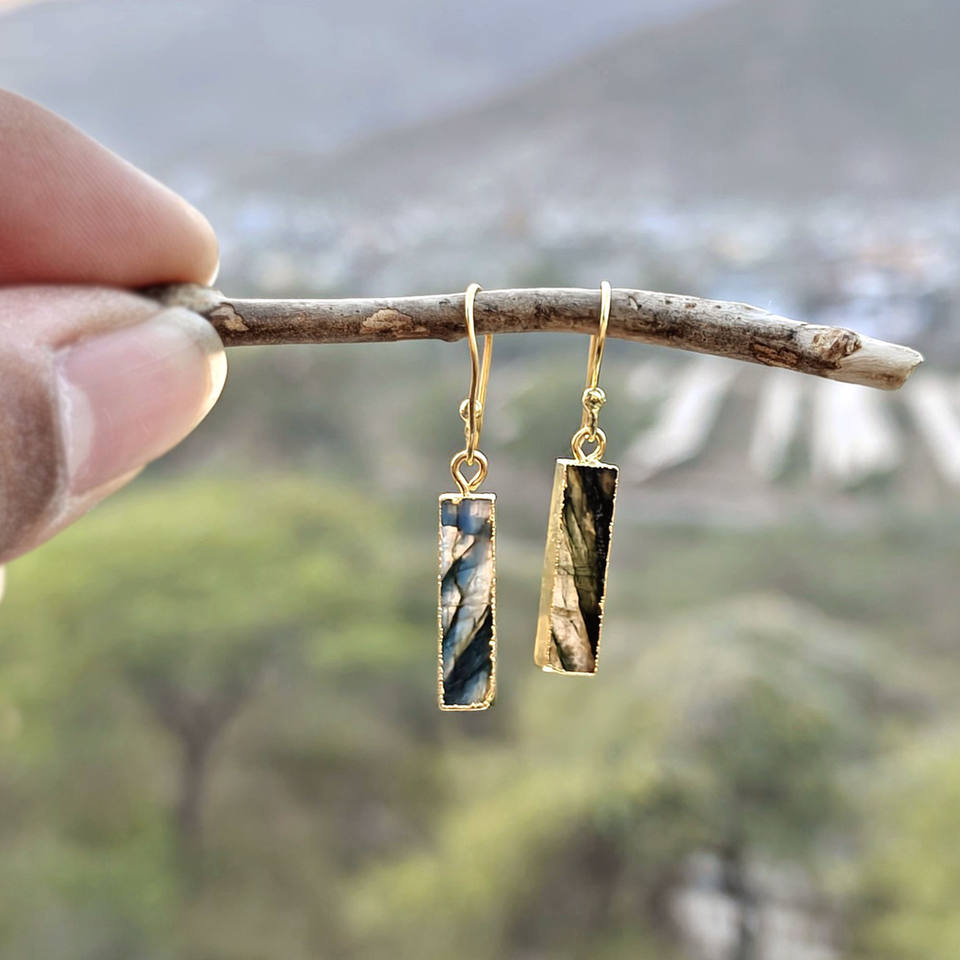 Hypoallergenic jewelry natural multi fire labradorite bar shape earring brass 18k gold plated light weight everyday wear earring