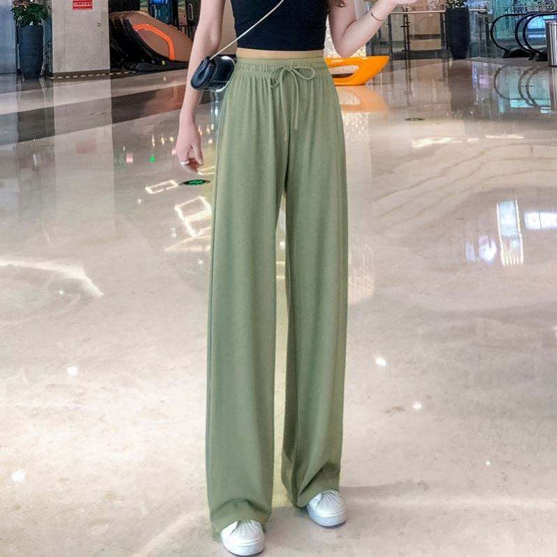 I-0510 Women Summer Ice Silk Loose Pants High Waist Wide Leg Straight Casual Long Trousers